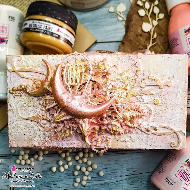 Madhurima here and today I am here again to inspire you all with another mixed media style project. Today I will show you how to altered old cellphone box which was just lying around and was gathering dust. Valentine's week is round the corner and this will be a great gifting option for your loved ones. Just put your favourite chocolates or any other gifts you want to give and voila you are all sorted. To create this box I have used stencils and chipboards to create my composition along with some clay embellishments that was in my stash. Here are a closed look at my project. Do share you comment on this and I really hope that you all liked it. The entire product list is at the end.